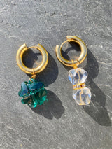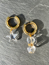 Crystal Clear earrings will naturally make you shine! The gold-tone metal mismatched hoops feature crystal beauty in different forms. a crystal star dropped elegantly from one of the earrings while the other features a range of quartz elements mixed with strass.
