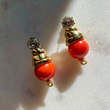 They feature a bold gold-plated bell pendant carrying a shimmering coral bead.