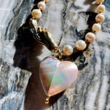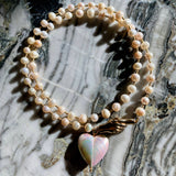 Handsome necklace is threaded with natural shimmering freshwater pearls and gold Miyuki beads. It features a gold-plated hand adorned with a mother-of-pearl heart drop. The Handsome necklace fastens with a gold-plated magnetic clasp.
