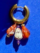 A gold-tone metal hoops embellished by drop Africa fire agate drops, tiny amethyst beads, and strass.