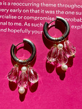 A silver-tone hoops with transparent crystal drops, shimmering freshwater pearls and strass.