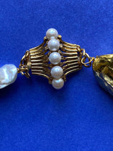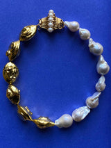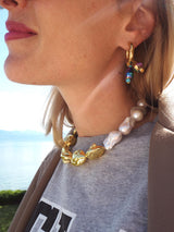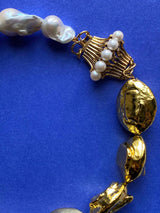 This statement choker marries opulence with a feminine touch. One half of the jewelry piece is crafted with baroque pearls and the other is made with sculptural golden metal beads.
