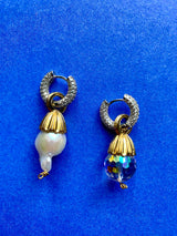 Ring my belle mismatched earrings are made of sleek silver-tone hoops embellished with glistening crystals. They feature 2 delicate gold-plated bells, one casts a shimmering baroque pearl and the other a disco ball pendant.