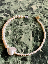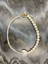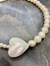 White Fantasy choker is handcrafted with 2 different sizes of freshwater pearls that frame a mother of pearl heart bead, then finished with a gold-plated spring-ring clasp.