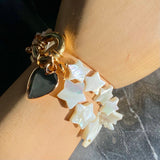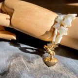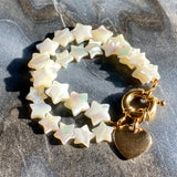 Celestial bracelet is threaded with a double layer of mother-of-pearl beads all in the shape of stars. The bracelet features 24kt gold-plated details as a heart pendant and ring claps.