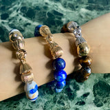 Hooked bracelet is an elastic bracelet strung with natural or ceramic beads and its finished with a 24 kt gold plated hook and details. Each bracelet is sold separately.
