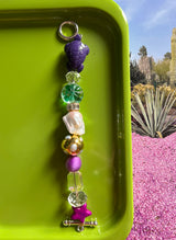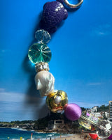 Crafted with an exquisite mix of shimmering glass beads of varying shades and colors, this piece is accented with a unique tortoise totem made of resin, a precious baguette cut crystal bead and a shining star. The baroque pearl is encrusted with golden chunky beads, which add an extra touch of elegance and playfulness to this stunning bracelet.