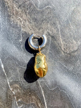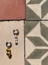 For Silver and Gold earrings are handcrafted with chunky silver-tone metal hoops, one of which hangs a baroque pearl dipped in gold and a drop of shimmering pearls adorned by a single multi-strass bead.