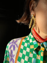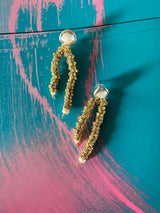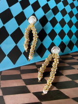 The sparkling DNA metal earrings have lustrous pearl that hold 2 strings made of shimmering crystal rondelles linked together
